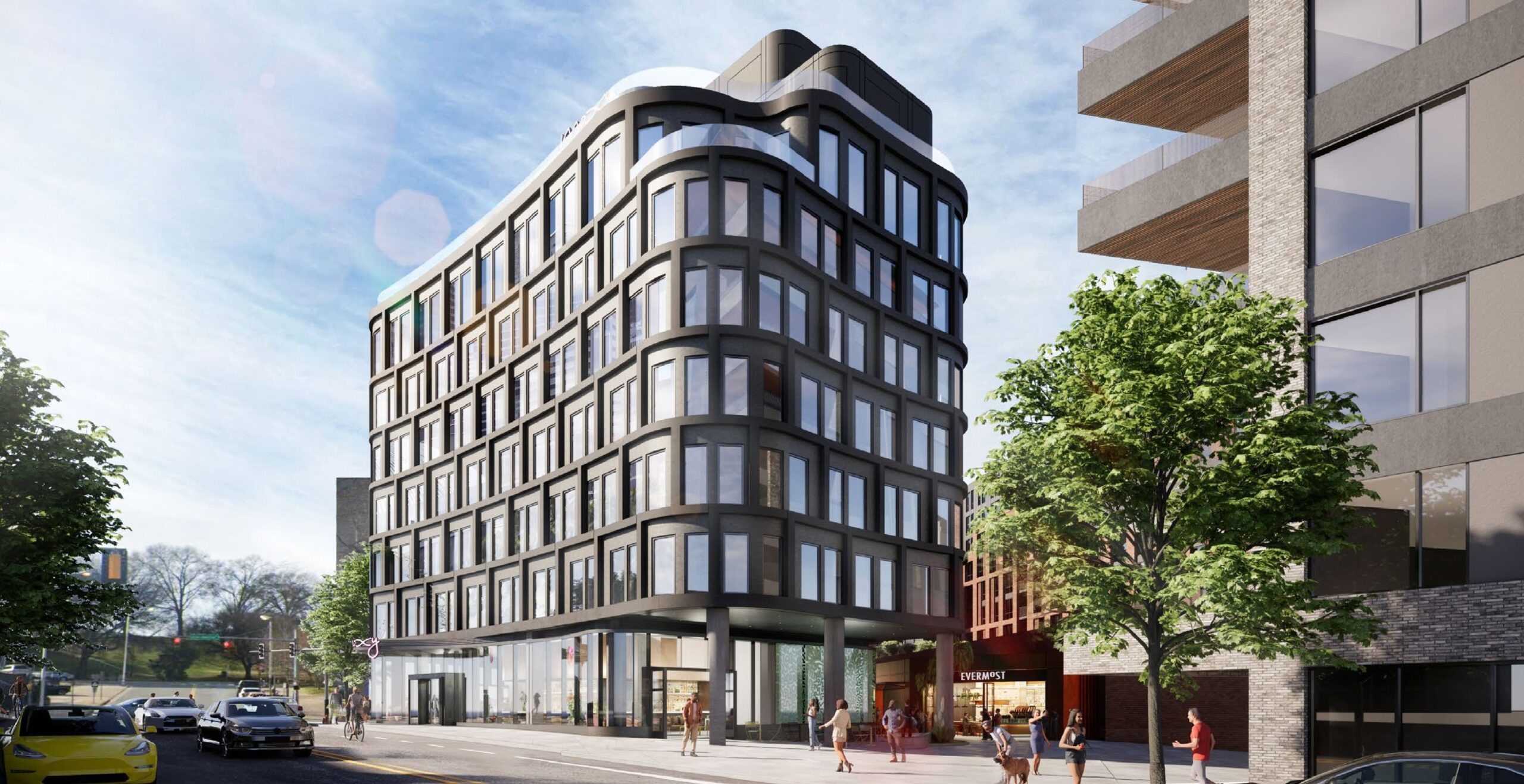 The Bend features a 188-key Moxy Hotel, 128 fully furnished Apartments by Marriott Bonvoy (The Delle), 133 for-rent residences, and 17,000 square feet of street-level retail—all tied together by a paseo designed to foster connection.